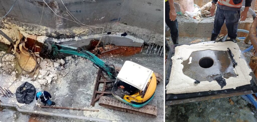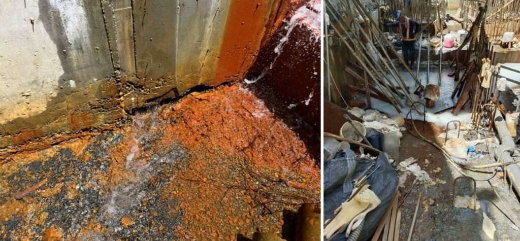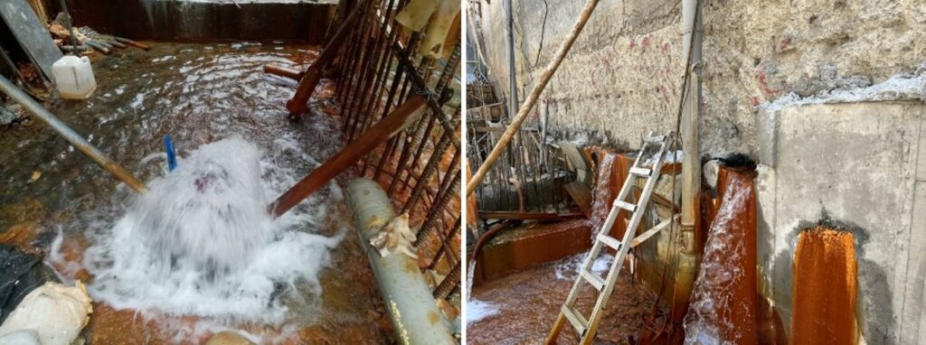 施工時因為主要湧水點封堵後,地下水經由其他混凝土弱面滲出,所幸經過前期大規模出水點有效封堵後,滲入工作面的水量已大幅度減少。經過專業廠商採用適當止漏方式逐處灌注後,各滲水點陸續被封堵完成。經施工單位審慎查核後,現場達到適合後續施工及設備安裝條件,圓滿達成降挖基礎二次施工縫湧水封堵工作。