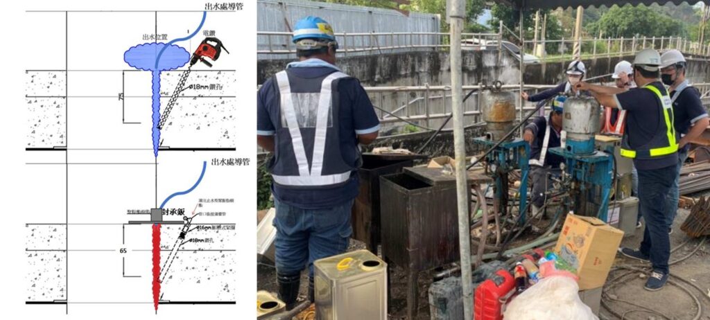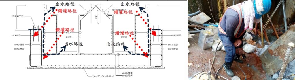 本次湧水封堵目的為降低地下水湧入施工面至可以繼續施工條件,同時填充黏結因地下水析離之混凝土孔隙,並適度擠壓、填充迎水面地層,加固地層強度。為配合工程特性及需求,進行施工設計如下: