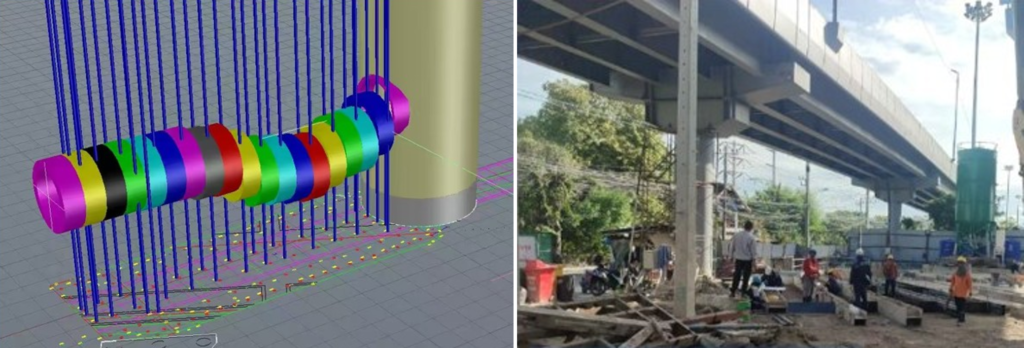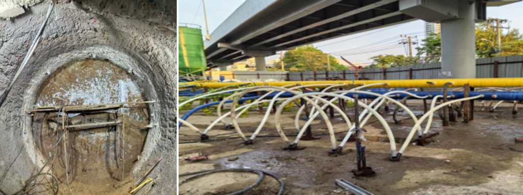As Thailand is a tropical country, the high temperatures of the air, ground, and groundwater presented significant challenges for implementation of the artificial ground freezing method. In addition, the construction site was located beneath an elevated bridge, with numerous and complex surface and underground structures requiring protection.