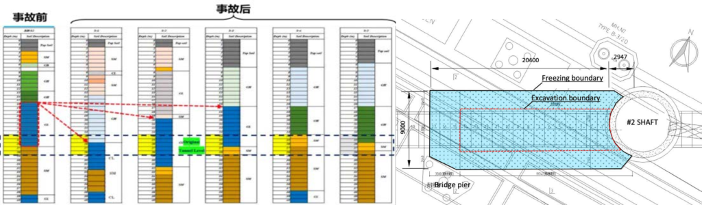 This incident occurred at a depth of approximately GL-26.0m to GL-30.5m below the urban surface. The ground surface included elevated bridges, major roads, residential buildings, and high-voltage transmission towers, while underground utilities included shallow buried drainage box culverts, sewer pipelines, and various public utility lines. In addition, underground obstructions such as sheet piles were present around the shaft. The site was also located near the Chao Phraya River, with abundant groundwater exhibiting flowing characteristics.
