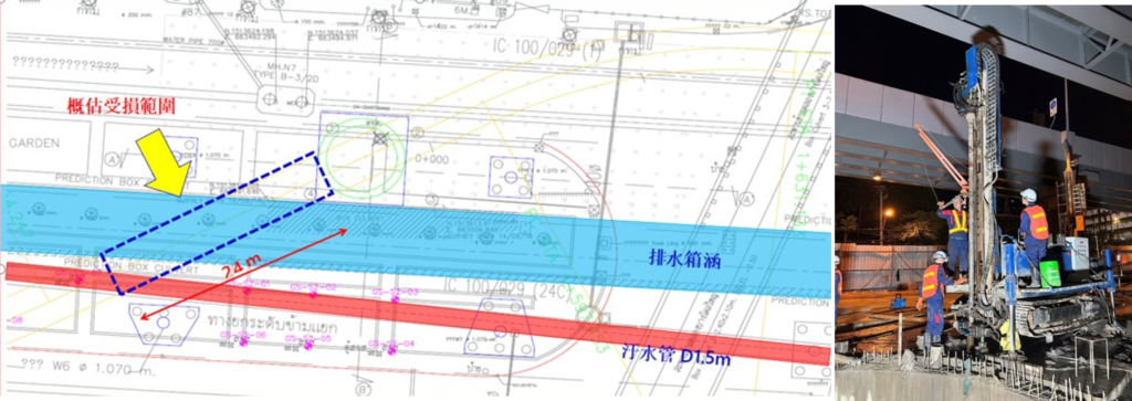 During construction of a TBM tunnel in Thailand, settlement and displacement occurred at the connection between a shaft and the tunnel, resulting in groundwater and sand inrush into the underground space and causing tunnel collapse. To protect surface structures, shallow box culverts, and various utility pipelines, the contractor carried out emergency backfilling of the collapsed area and continued ground improvement grouting at and around the collapse location; however, the results were not satisfactory.