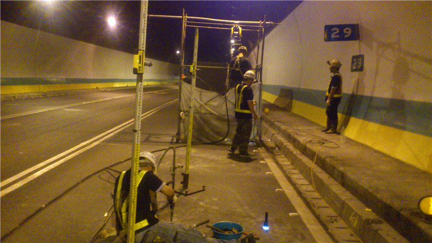 为改善碧潭隧道路面沉陷、积水及破裂,故进行地盘改良灌浆,使用聚胺脂树酯浆材,改良1.5m深度范围之地盘。应用聚胺脂树酯速凝与高强度之特性,于夜间施工后日间即开放通车,本案除达地盘固结改良目的,并维持高速公路车流之使用性能。